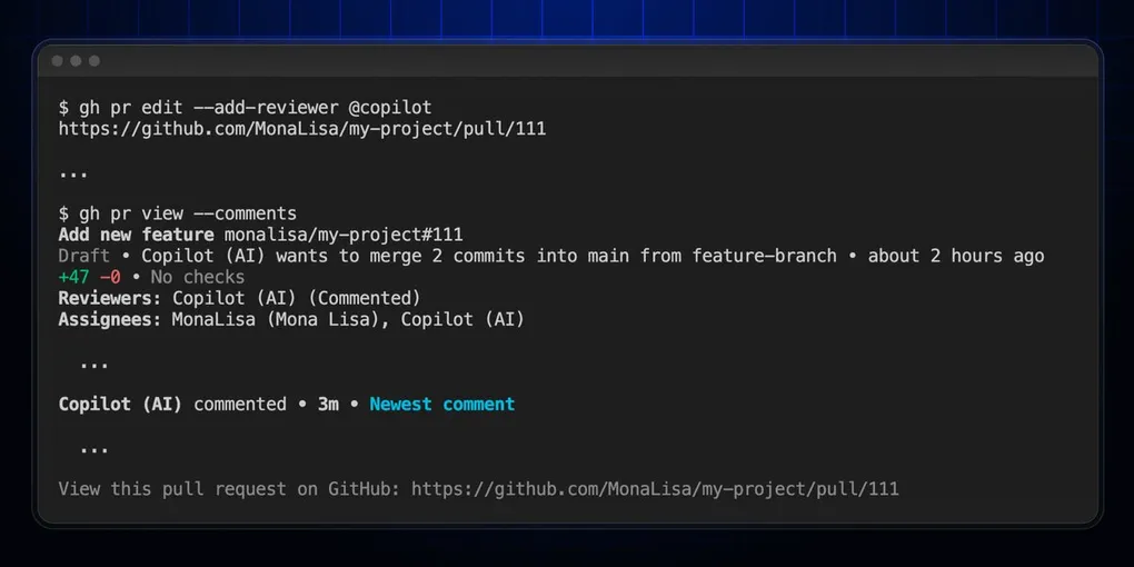 简单来说,这项功能允许开发者通过 gh 命令行工具,在创建或编辑 PR 时直接分配 @copilot 作为审查者。Copilot 会自动分析代码变更并给出审查意见,整个过程都在终端完成。