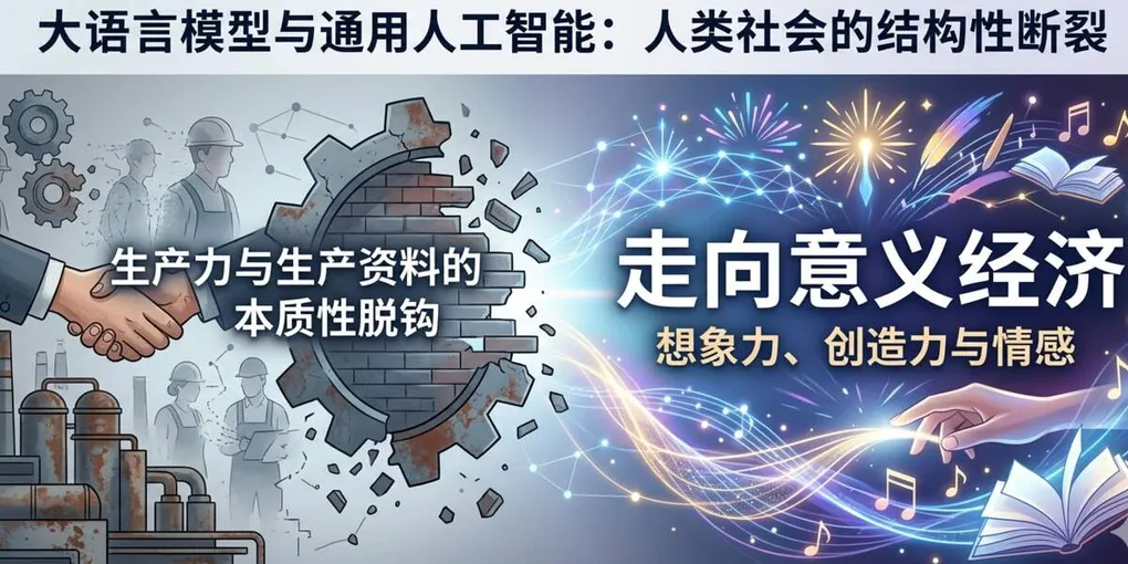 随着大语言模型(LLM)及通用人工智能(AGI)的加速渗透,人类社会正面临一场史无前例的结构性断裂:生产力与生产资料的本质性脱钩。传统资本逻辑下的雇佣关系——资本家拥有生产资料,通过雇佣劳动者完成增殖——正因AI对人类劳动的系统性替代而趋于崩塌。本文论证:在资本意志加速”去人化”与社会本能被动”自愈”的双重挤压下,人类正被迫且必然走向以想象力、创造力与情感为内核的意义经济——这不是众多路径之一,而是唯一路径。